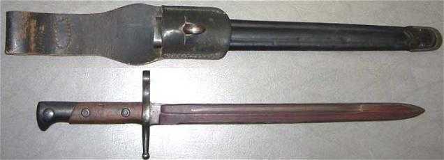 All metal surfaces of the bayonet and scabbard was originally blued. The wood grip is smooth with no checkering.