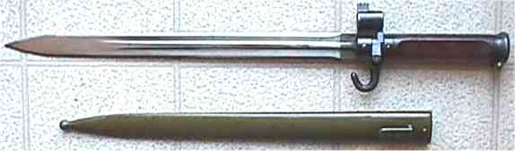 with front sights. Infantry issued bayonets were made without the front sight. Bayonet is 480mm overall, 340mm long double edged blade. 15mm dia socket sleeve. Weight .50kg. Blade width 25mm, thickness 11mm. Serial number prefixes