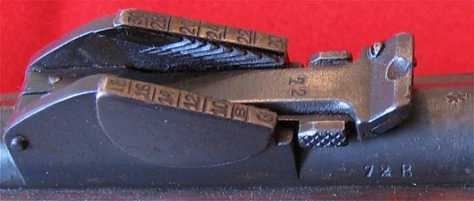 the M90 cartridge, over the old M1888 black-powder graduations on the side of the quadrant-base. Rifles made after 1890/91, generally known as 'M1888-90',