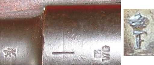 calibration markings. These rifles have a crown over 'F' stamp or a small Bulgarian rampant lion stamp on the barrel, as shown above at the M1888 rifle.