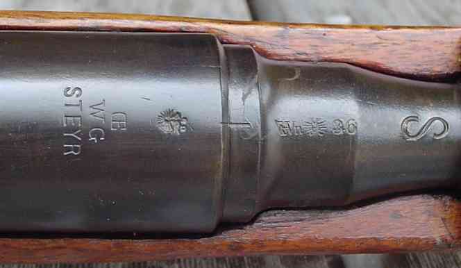 were re-barreled or re-chambered for the 8x56 cartridge and had new back sights installed. The original M90 'OEWG' markings and the two-headed Austrian Eagle stamp was retained. The barrel shown here is Wn 36 (1936) stamped indicating the modification/acceptance date. The date was overstamped in 1940 with '40' indicating a re-issue. |