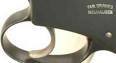 Two slightly smaller models were made by 'Fab. d'Armes Neuhausen' (SIG = Schweizerische Industrie-Gesellschaft) for trials in Switzerland. Several first-type 7.6mm guns (230mm long, weighing 1,000g) were made in 1894, followed by 50-60 pieces of a modified second type (215mm, 850g) chambering a 6.55mm cartridge, another straight rimmed round. Production continued until 1897. |