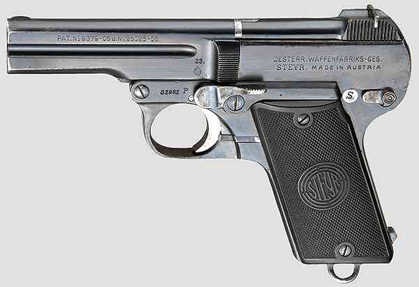 thumb-latch barrel-locking mechanism. The recoil-spring rod ended in a hook engaging a lug on the slide, disengaging automatically when the breech was raised. The Steyr gun differed from the Pieper pattern in the following minor details: The angle of the pistol grip was increased, the grips were attached with 2 screws instead of 1, the barrel was lengthened, the rear sight was revised. This was a favorite private purchase pistol for Austro-Hungarian Military officers and Police departments. Manufacture was started in 1909 and suspended in 1911. Some historians claim that manufacturing continued until 1914, but we have no examples reported with manufacturing dates during 1912-14. Maybe those historians' confusion comes from the fact that there are 1911 manufactured pistols, which were accepted in 1914 by the Landwehr. Manufacturing resumed in 1919. They reused some parts already pre-manufactured, so serial numbering and dates are overlapping. Manufacturing continued until 1929. Some historians claim that manufacturing continued until 1939, but we have no examples reported with manufacturing dates beyond 1929. The pocket version of this Pistol is the Steyr-Pieper M1909 |