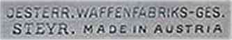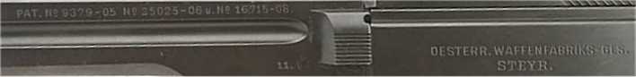 The Legend on the left side of the receiver: 'OESTERR. WAFFENFABRIKS-GES. STEYR' and on the left side of the barrel: 'PAT.No.9379-05 u No.25025-06'.