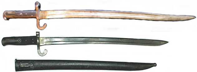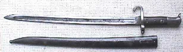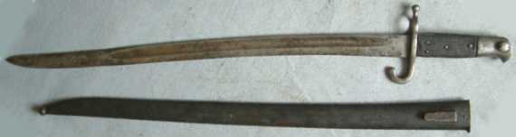 ![]() Original M1867 saber (Yataghan style) bayonet. 700mm overall, 572mm blade length. Hard leather grips, hooked quillon. The muzzle ring finial was used as the front sight. Single edged blade, fullered both sides. Scabbards were originally heavily blued. Most bayonets were shortened by approx. 100mm, (see below) so original length bayonets are rare. |