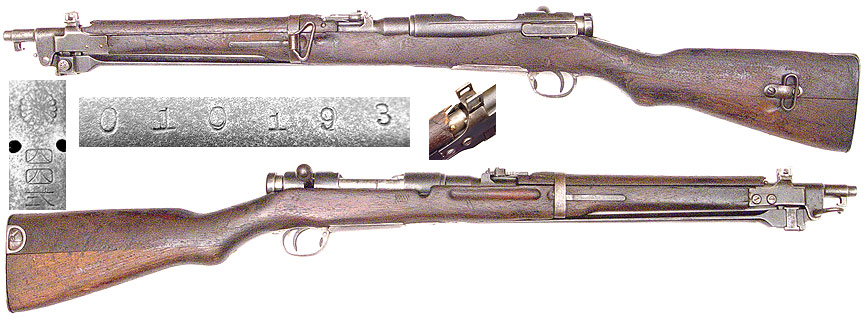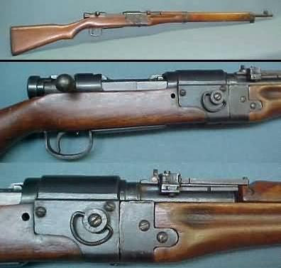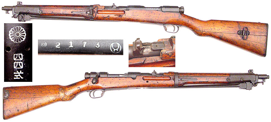 Made by Imperial Artillery Arsenal, Koishikwa, Tokyo, 1899-1907 Quantity: 550,000 rifles and 40,000 carbines Turning bolt action with two lugs on the bolthead and the bolt handle turning down into the receiver slot Caliber 6.5x50mm semi rimmed 1274mm overall, 789mm barrel length, 4 to 6 grove rifling, rh, polygonal Internal charger loaded 5-rd box magazine Leaf sight graduated to 2000m Weight 4.01kg 775m/sec muzzle velocity with Type 30 ball ammo Photo courtesy of CollectibleFirearms.com |