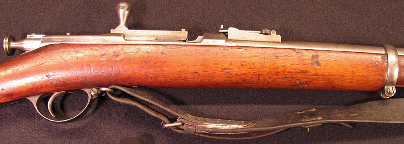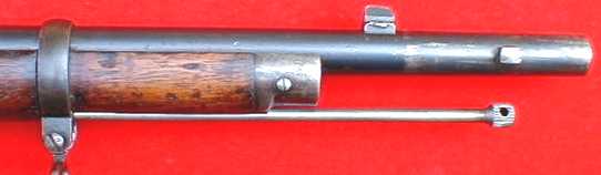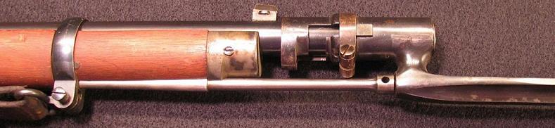This rifle had no provisions for a bayonet. The sling swivels were slot-mounted. Examples can be found with 2 barrel lengths 20mm apart.