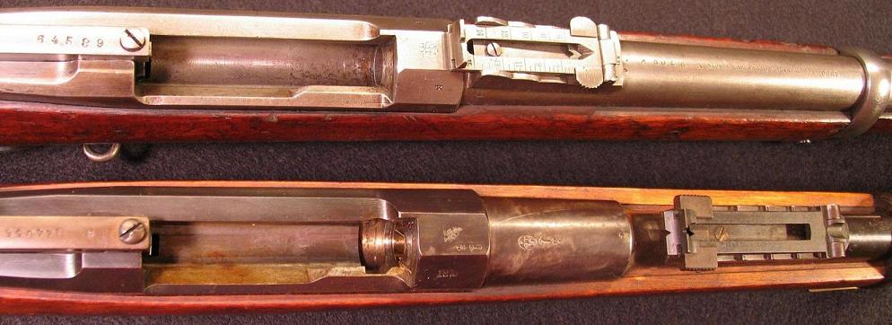 The new M1891 type rear sight was mounted forward of the chamber area. A new locking lug recess and raceway was milled into the receiver. A new bolthead with 2 locking lugs were made to withstand the higher pressure of the new M1891 cartridge. In 1905 a similar conversion of the 10.67mm