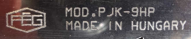 The slide legend next to the FEG logo: 'Mod. PJK-9HP Made in Hungary'