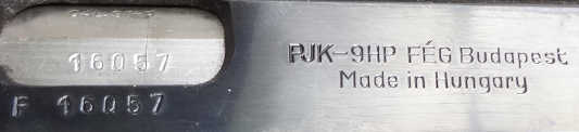 The slide legend (the FEG logo was omitted): 'PJK-9HP FEG Budapest Made in Hungary'