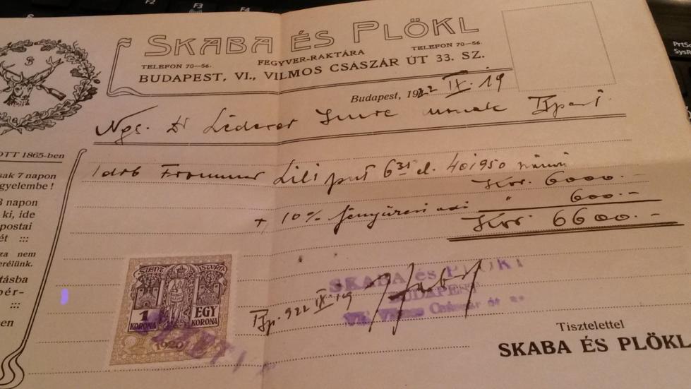 1922 dated Bill Of Sale to purchase a Frommer Liliput Pistol (Courtesy of Gabor Schneider)