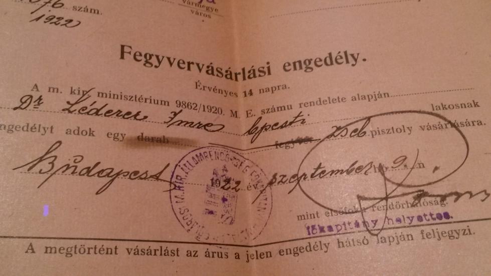 1922 dated Firearm Purchase Permit for one Pocket Pistol (Courtesy of Gabor Schneider)