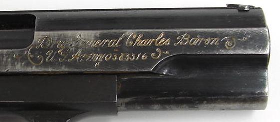 This P37 pistol was marketed as a presentation piece with the legend: 'Brig. General Charles Baron US Army 0363316'. Unfortunately this is false. Charles Baron was a