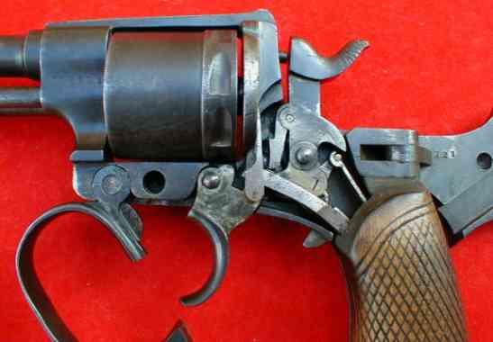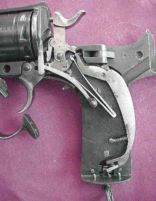 on the right side of the frame behind the cylinder disconnected the hammer from the trigger when it was opened for loading. The trigger mechanism could be