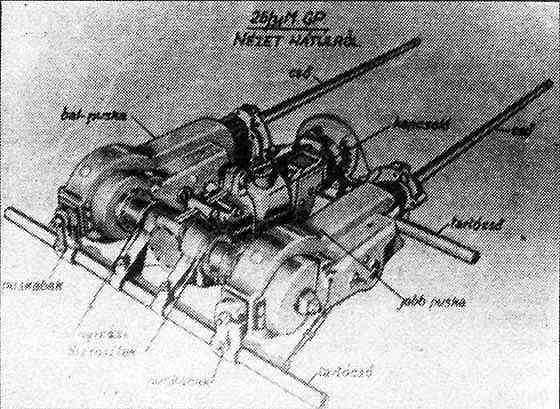 In 1917 Gebauer submitted his first motor driven machine gun design to his Air Force Field Colonel. He received the approval to make prototypes. The first two variant was not succesful, but the third improved design performed flawlessly on its trial in June, 1918, on the Aspern Airport. The trial gun