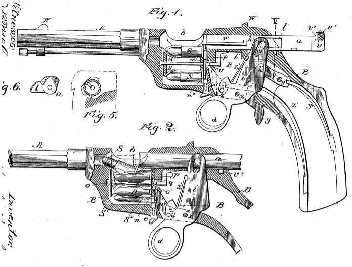 Fig.1 shows the section of the gun with the bolt in its rearmost position. Fig.2 shows the bolt moving forward, loading the upper cartridge of the magazine.