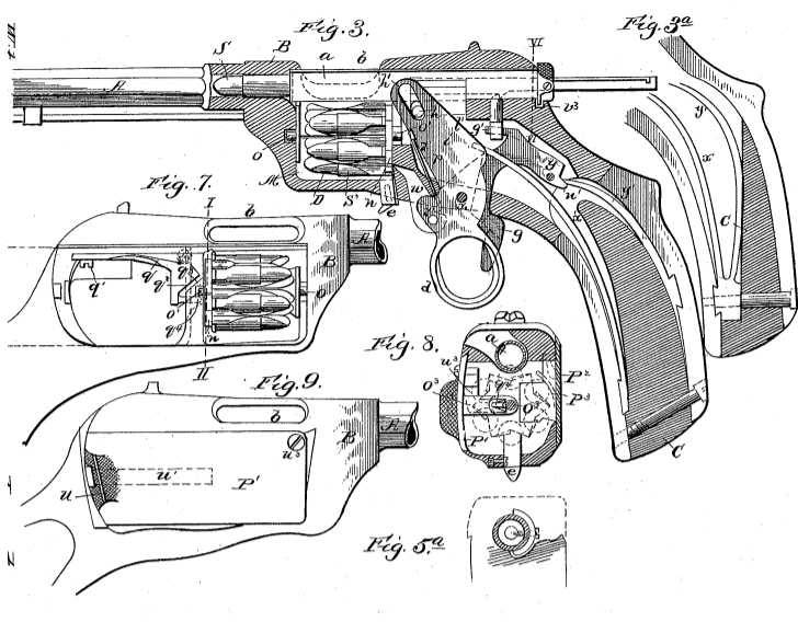The revolving magazine utilizes elastic bedding to hold the cartridges (Possibly the weak point of the design.)