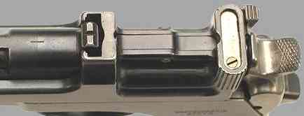 which drops in front of the hammer when applied. Early guns have front sights with a rounded leading edge, later ones being vertical. The original back