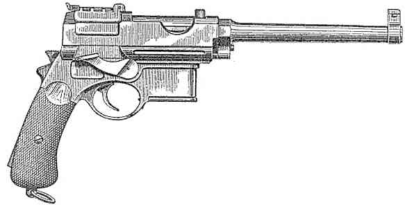 This was the last Mannlicher pistol to be marketed commercially, though development had begun in 1896 and a gun (possibly made by 'Waffenfabrik Neuhausen) was tested in Switzerland in 1897-8. It chambered yet another special cartridge, a 7.65mm bottle-necked rimless round offering the same dimensions as the 7.63mm Mauser but less velocity. This was a grave mistake, as the Mannlicher pistol was not strong enough to stand up to firing the Mauser round. A strengthened model was produced experimentally in the early 1900s but was never exploited. Mannlicher had died in 1904 and his locked-breech pistol was soon overtaken by more effectual rivals.