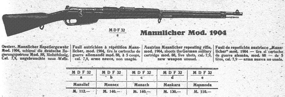 Caliber 7.92x57mm, used a Gew.88 type clip. 12,000 rifles were sold to the Irish Ulster Volunteer Force (Protestant Militia).