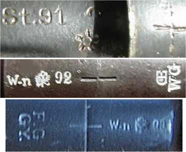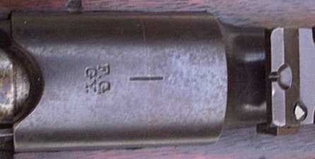 calibration markings. These rifles have a crown over 'F' stamp or a small Bulgarian rampant lion stamp on the barrel, as shown above at the M1888 rifle.