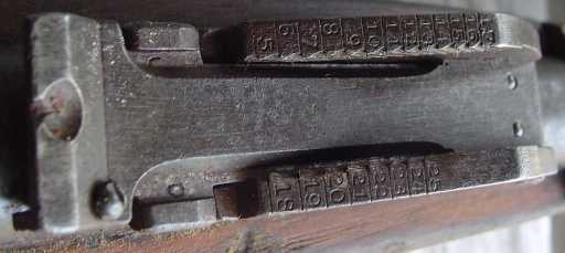 the M90 cartridge, over the old M1888 black-powder graduations on the side of the quadrant-base. Rifles made after 1890/91, generally known as 'M1888-90',