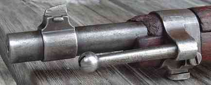 under the barrel-band, while the nose cap (which carried the stacking hook) had the bayonet lug on its underside. The magazine clip could be ejected by
